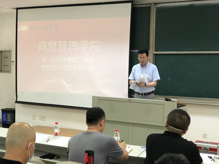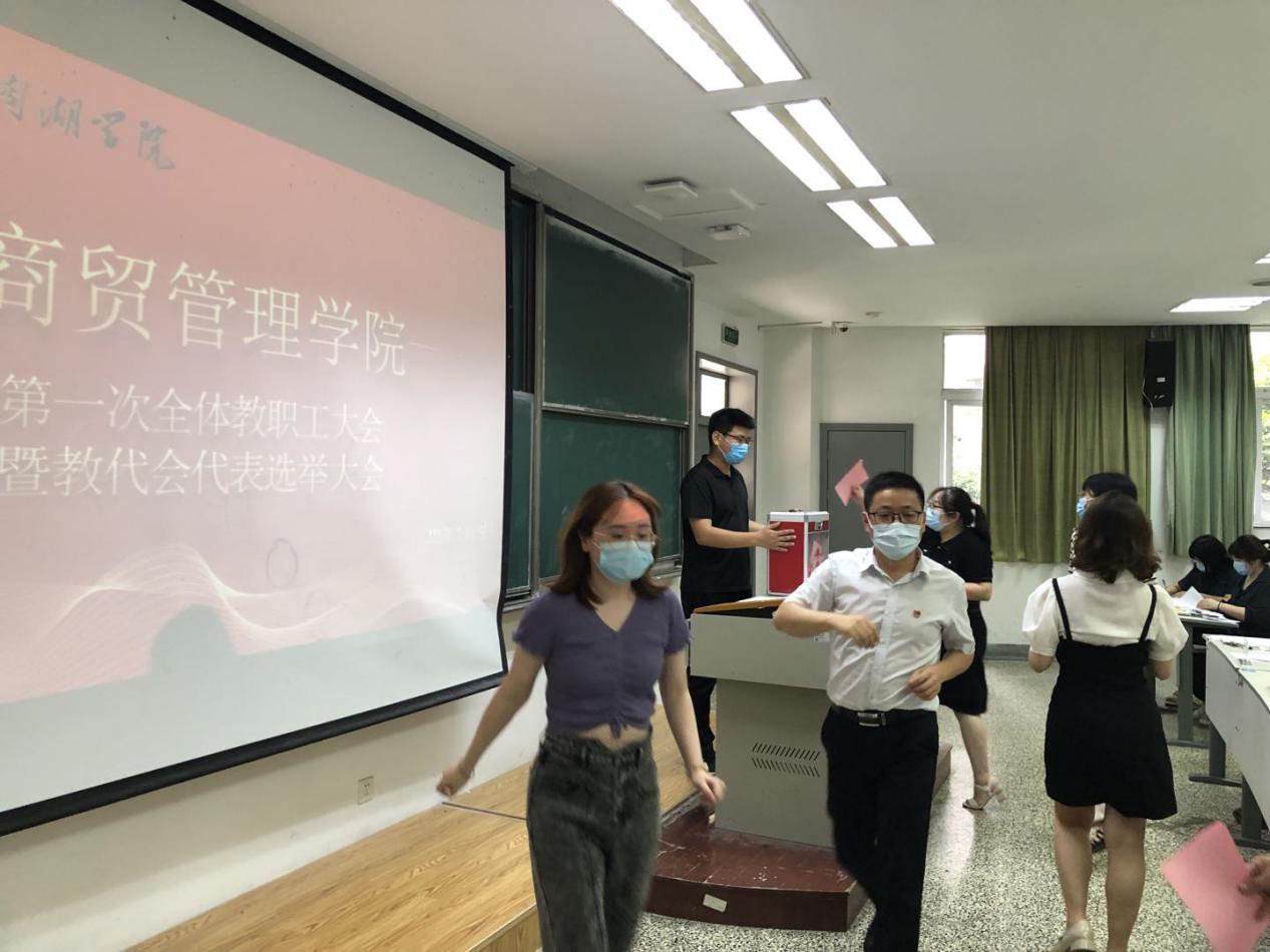 2021年7月5日下午,pp电子游戏平台官网在教一159召开第一次教职工大会。大会主要围绕pp电子游戏平台官网干部人事安排、嘉兴南湖学院第一届教代会代表推选等议题展开。校党委副书记郭坚刚同志在组织部方海涛副部长的陪同下出席大会,大会由副院长孔冬教授主持。