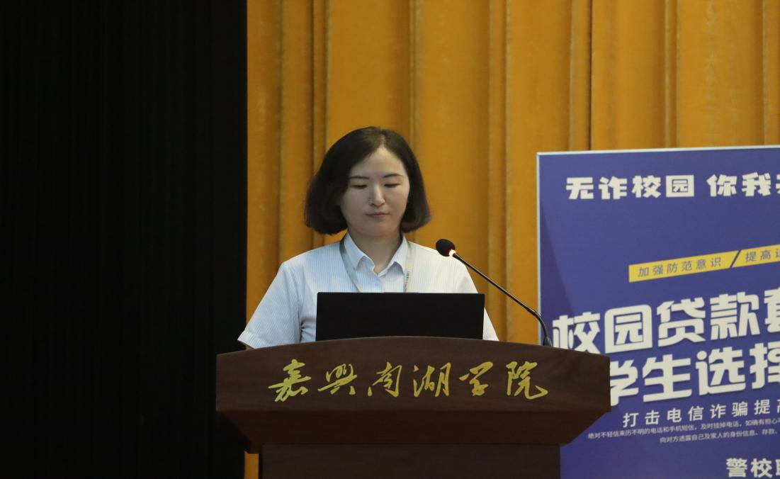 为进一步提高同学们防范电信网络诈骗意识和能力,9月6日晚,由嘉兴金融团工委主办,民泰银行嘉兴分行承办的反诈宣传讲座于嘉兴南湖学院第二报告厅举行,此次讲座的主题是“筑牢校园安全的屏障”。讲座由民泰银行嘉兴支行工作人员吴萌萌女士主讲,pp电子游戏平台官网全体新生参与此次讲座。