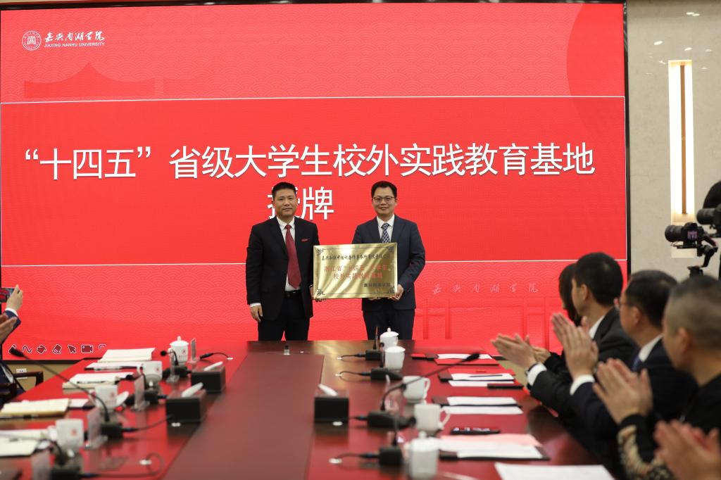 副校长陈加明为与嘉兴知联中佳税务师事务所联合申报并成功获批“十四五”省级大学生校外实践教育基地的“嘉兴知联中佳大学生实践教育基地”授牌。