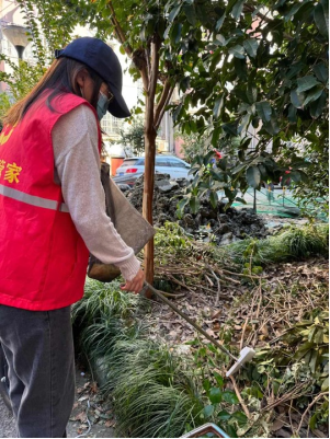 在社区工作人员的带领下,各位志愿者们身穿统一的红色马甲,分组来到社区各个点内,利用手中的扫把、夹子、铲子等各类工具,对金都景苑社区进行了清扫,仔细清理着社区草坪花丛内的烟蒂、纸屑和塑料袋等。