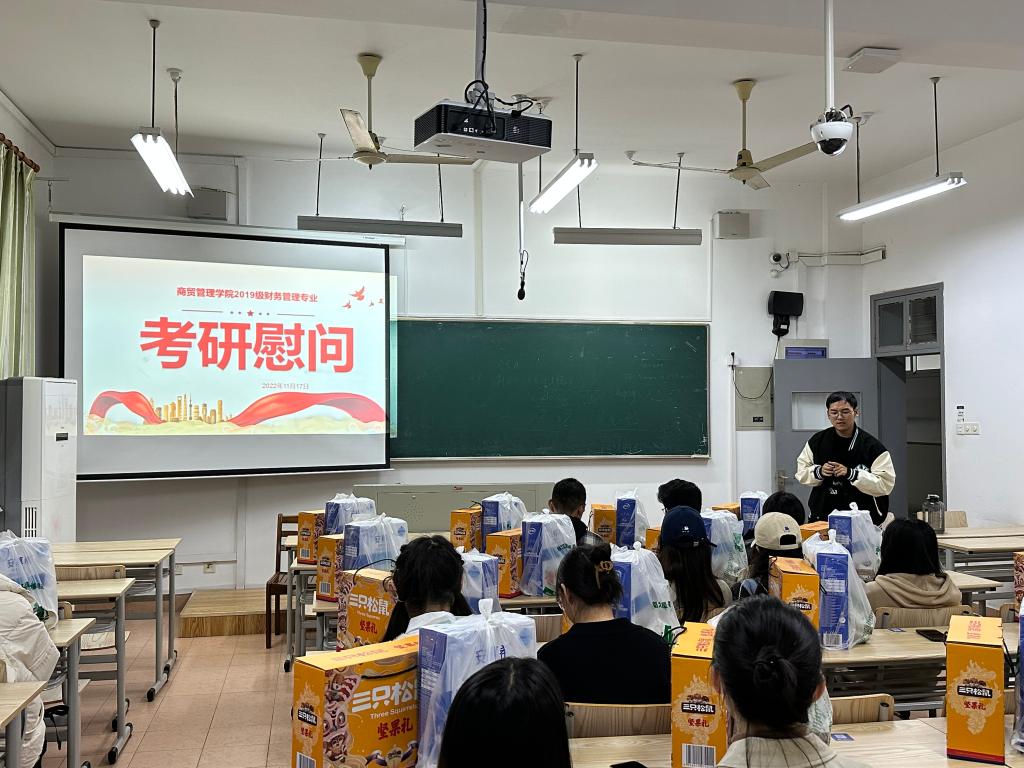 为了更好地引导商贸学子全力准备全国硕士研究生统一招生考试,鼓舞考研学生的士气,坚定考研信心,最大程度缓解考研学子的心理压力,pp电子游戏平台官网于11月17日下午在第一教学楼分别开展了财务管理、工商管理、房地产开发与管理、人力资源管理、市场营销和会计学专业的考研学生慰问会。